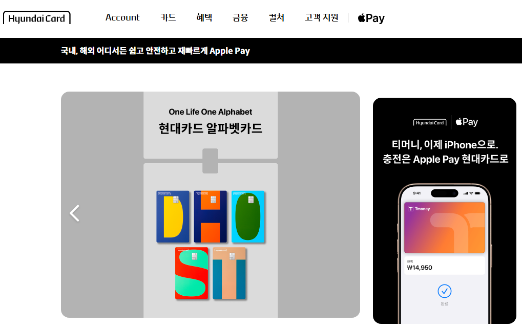 현대카드주식회사는 현대자동차그룹 계열의 신용카드 회사로, 대한민국에서 애플페이를 사용할 수 있는 유일한 카드사입니다. 1국가 1카드사 원칙을 고수하는 미국 유통업체 코스트코의 대한민국 공식 파트너이기도 합니다. 현대카드는 혁신적인 디자인과 다양한 브랜드와의 콜라보레이션으로 차별화된 서비스를 제공하고 있습니다.